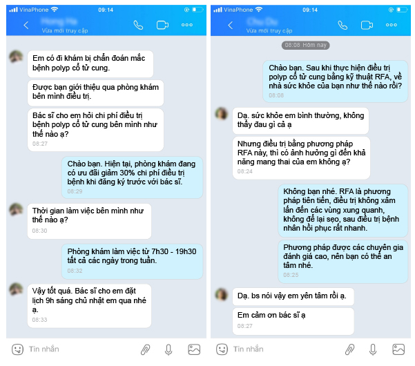 Phòng khám đa khoa y học Nghệ An đã tiếp nhận và điều trị thành công cho nhiều trường hợp bị mắc bệnh polyp cổ tử cung. Nhận được phản hồi tích cực từ phía bệnh nhân: