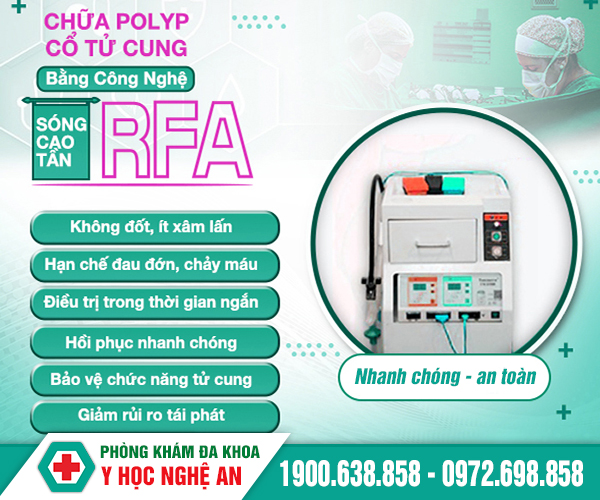 Lựa chọn phòng khám đa khoa y học Nghệ An chị em không chỉ được điều trị polyp cổ tử cung với chi phí hợp lý. Mà còn được chữa trị bằng phương pháp tân tiến. Công nghệ sóng cao tần RFA giúp loại bỏ khối polyp nhanh, an toàn.